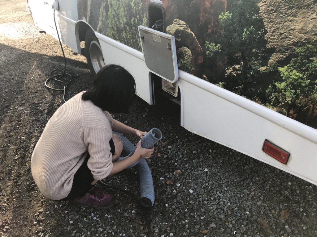後方部分に排水する場所があり、そこに専用のホースを装着させ、ホースの出口はRVパーク内にある専用の排水口へつなげます。