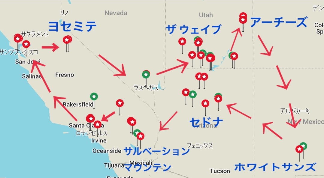 サンフランシスコ➡︎ヨセミテ国立公園➡︎ラスベガス➡︎ブライスキャニオン国立公園➡︎ザ ウェイブ➡︎ホースシューベンド➡︎ローワーアンテロープキャニオン➡︎モニュメントバレー➡︎アーチーズ国立公園➡︎ホワイトサンズ➡︎グランドキャニオン➡︎セドナ➡︎サルベーションマウンテン➡︎ポテトチップロック➡︎ルート66➡︎カリフォルニアディズニー➡︎ロサンゼルス➡︎サンフランシスコ
