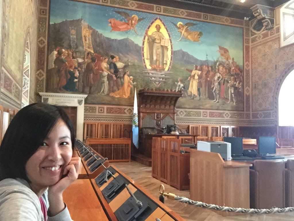 私は国会議事堂の席に座り、ここでサンマリノの政治が行われているのかーと想像を膨らませました♡